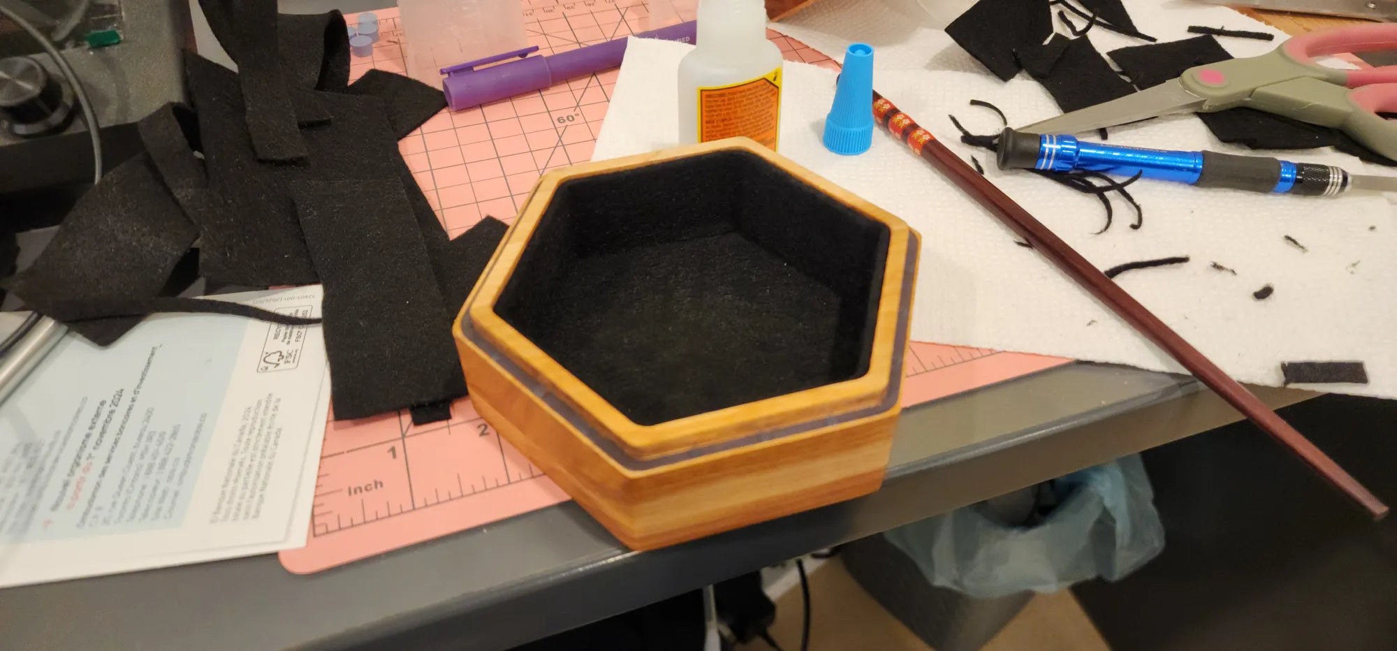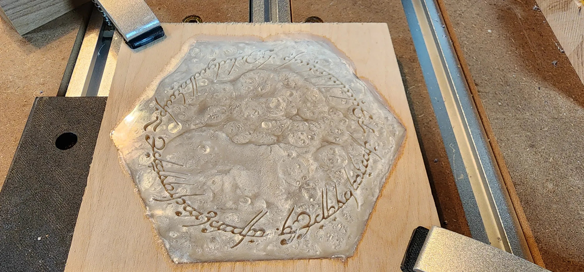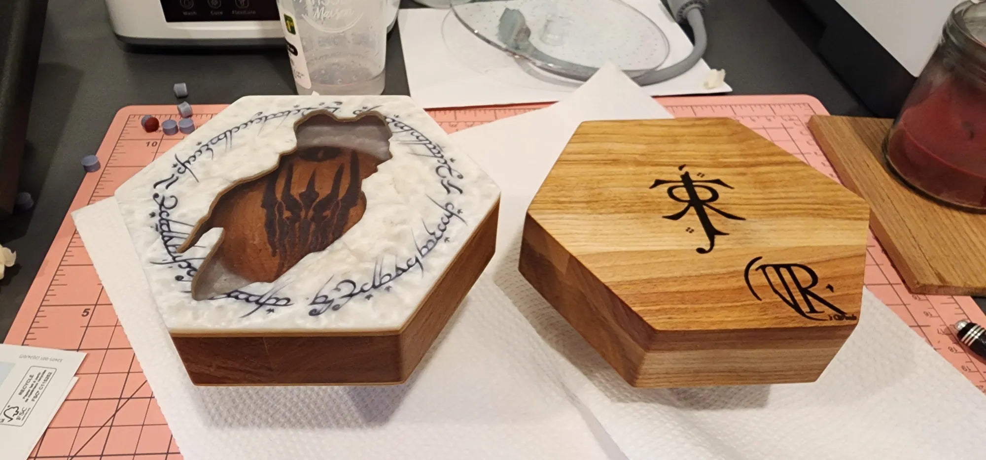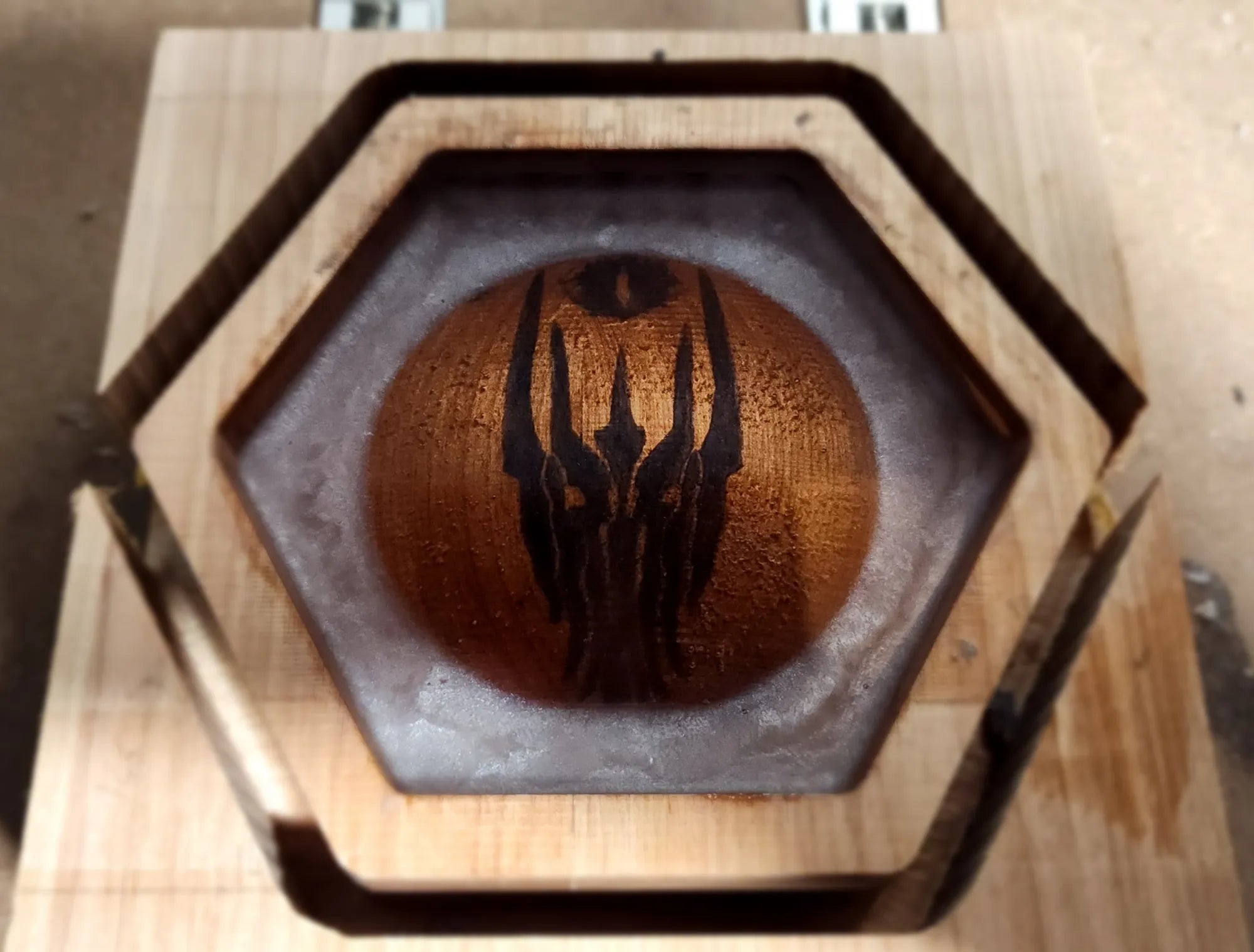 Handcrafted with care and forged from the finest wood I could find, this box was created as a tribute, a custom gift for a friend whose heart beats to the rhythm of dice rolls and heroic tales. More than a simple container, this hexagonal artifact draws inspiration from the worlds of Tolkien and the mythos of Dungeons & Dragons. The exterior bears the mark of the Professor himself, while the inside reveals a burning sigil, the Eye of Sauron, ever watchful. Surrounding it, elvish script whispers forgotten enchantments, as if echoing the One Ring’s curse. Within, crimson dice await their fate, ready to decide the destiny of heroes and villains alike. This isn’t just a dice box, it’s a vessel of storytelling, forged for the Dungeon Master who brings entire worlds to life.